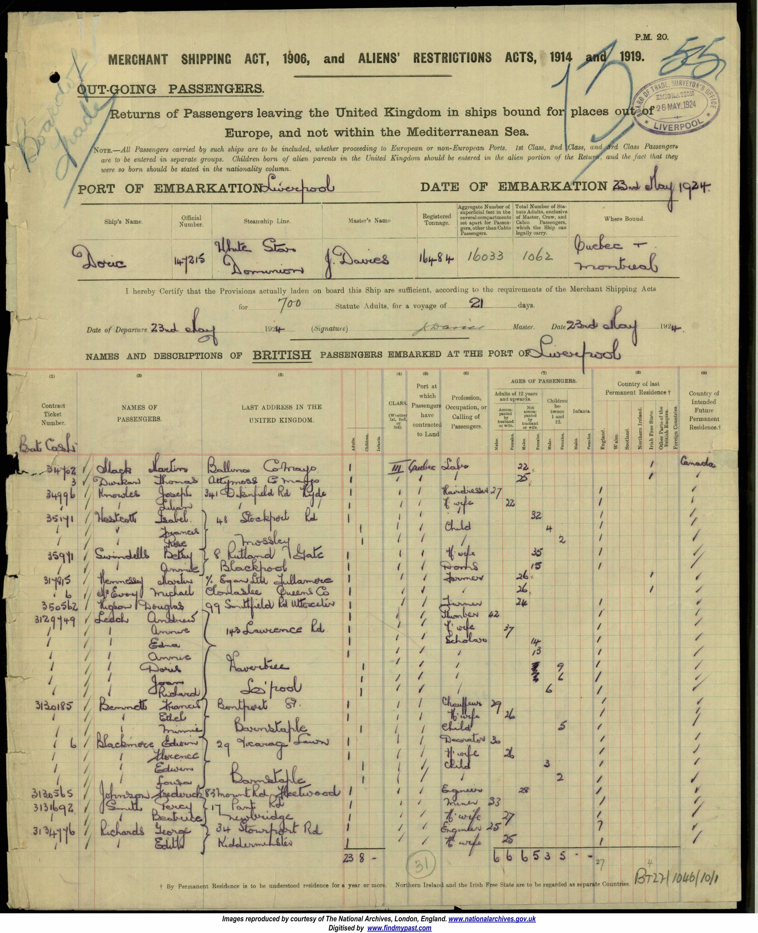 Sarah was born on 4 February 1892 in a Townland called Graigueafulla in the Clonaslee district in Queens County, rechristened “Laois” County after British-themed place-naming became somewhat unfashionable. Her older sister Margaret left for America on 4 June 1908 from Cobn (a seaport town on the south coast of County Cork) aboard the S.S. Umbria. Her brother Joseph left a year later, on 26 August 1909, aboard the S.S. Teutonic. Sarah arrived via the S.S. Adriatic with her sister Elizabeth on 17 November 1924. She was preceded by brother Michael and the future husband of Elizabeth, Martin Hennessey, who both arrived via a Liverpool to Quebec crossing on the S.S. Doric (arriving 23 May 1924) and then apparently via an "unofficial" border crossing at Windsor/Detroit (7 June 1924).